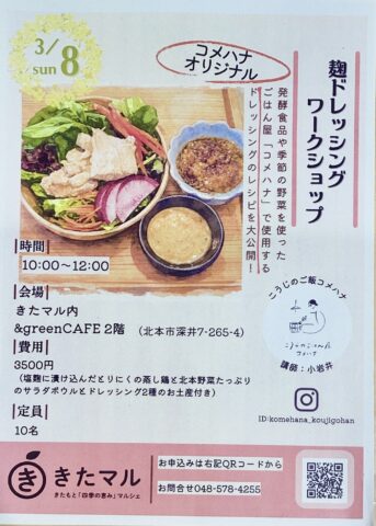 | 内容詳細 | 麹のごはん屋「コメハナ」で大人気の麹ドレッシングを作れるワークショップ開催 (塩麹に漬け込んだ鶏肉の蒸し鶏と北本野菜たっぷりのサラダボウルとドレッシング2種のお土産付き) |