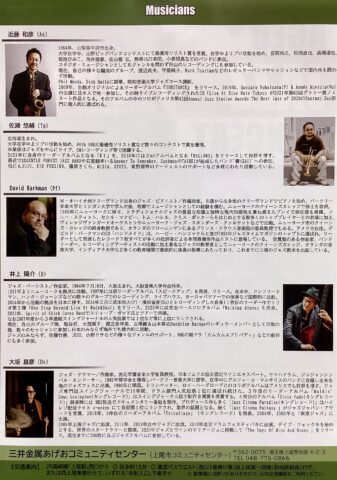 | 内容詳細 | 出演者:近藤和彦(As)、佐藤悠輔(Tp)、David Barkman(Pf)、井上陽介(B)、大坂昌彦(Ds)、おかのひろみ(Live Coordinate) ※都合により出演者変更の可能性あり |